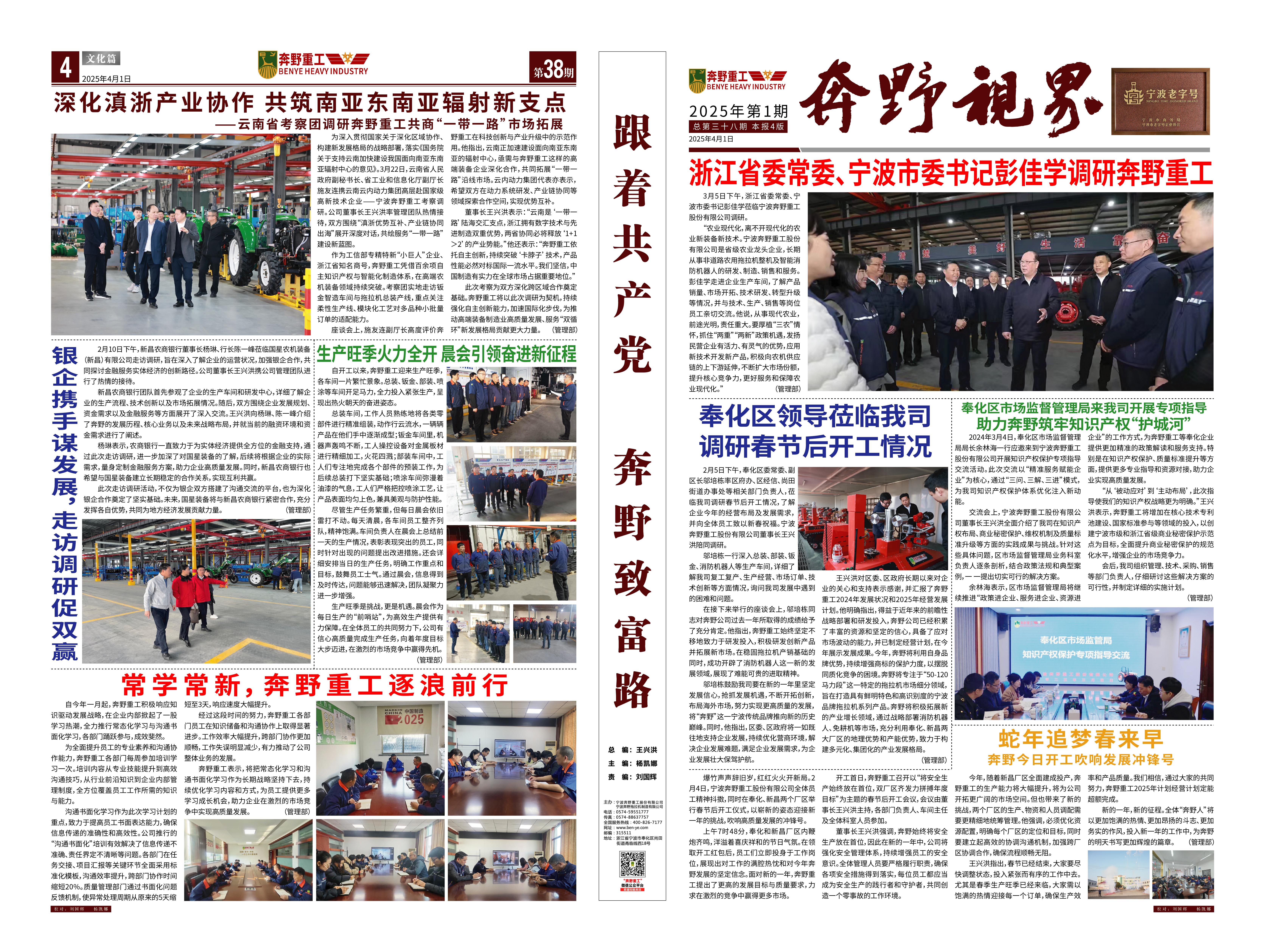 是一家非道路用農(nóng)用拖拉機(jī)整機(jī)及部件設(shè)備研發(fā)、制造、銷售、服務(wù)為一體的涉農(nóng)科研型生產(chǎn)企業(yè),專業(yè)生產(chǎn)寧波型奔野系列拖拉機(jī),是國家高新技術(shù)企業(yè)、工信部專精特新“小巨人”企業(yè)、浙江省知名商號(hào),寧波市級(jí)農(nóng)業(yè)龍頭企業(yè)、脫貧攻堅(jiān)-產(chǎn)業(yè)合作樣板企業(yè)、鄉(xiāng)村振興先進(jìn)集體,在寧波、新昌、吉林等地均設(shè)有生產(chǎn)基地,占地150多畝。公司現(xiàn)有技術(shù)骨干30多人,零部件自制化水平達(dá)到30%以上。公司目前擁有發(fā)明專利10余項(xiàng),實(shí)用新型專利、外觀專利、版權(quán)近50項(xiàng),擁有自主的知識(shí)產(chǎn)權(quán)保護(hù)品牌。公司所處的農(nóng)業(yè)農(nóng)機(jī)領(lǐng)域是國家重點(diǎn)關(guān)注和保障的、關(guān)乎國計(jì)民生的領(lǐng)域,得到國家和地方政府的大力支持,行業(yè)發(fā)展勢頭良好。